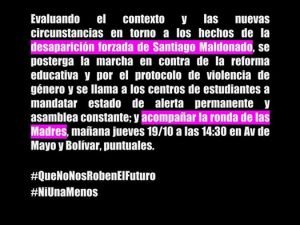 A raíz de la conmoción por el hallazgo de un cuerpo que podría ser Santiago Maldonado, el colectivo Ni Una Menos y la Unión de Trabajadores de la Educación, junto con un sector de la Coordinadora de Estudiantes de Base, resolvieron suspender la movilización «contra la violencia machista y la reforma macrista» prevista para esta tarde a las 16 horas aunque señalaron que «la postergación no implica la desmovilización”. La protesta había sido convocada el martes y tenía como consigna particular el repudio a la propuesta educativa “Escuela del Futuro”, lanzada por Horacio Rodríguez Larreta en la Ciudad de Buenos Aires. Además incluiría los reclamos históricos de Ni Una Menos contra la violencia de género y las violencias económicas y sociales que afectan a las mujeres, lesbianas, trans y travestis.