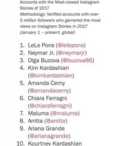 Según un listado emitido por Instagram, Maluma fue el cantante #1 en vistas de Instagram Stories en el mundo y la 7ma persona más vista en general. El artista continúa siendo el hombre latino #1 en seguidores en la plataforma social con 30.5 Millones.