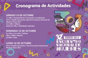 Será el 32° Encuentro Nacional de Mujeres que se realiza todos los años en distintas ciudades del país. Esta vez en Resistencia, Chaco los días 14, 15 y 16 y se calcula una convocatoria de entre 50 y 70 mil personas. De los encuentros participan referentes de distintas organizaciones, colectivos y movimientos por los derechos de la mujer. Habrá más de 70 talleres con temáticas diversas entre los que se destacan la lucha contra el femicidio, las violaciones, la trata, la legalización del aborto y los derechos de los pueblos originarios