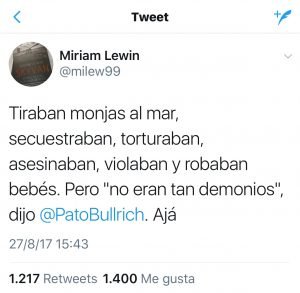 Patricia Bullrich fue el sábado al programa de Mirtha Legrand y siguió dando sus explicaciones de cómo se «evaporó» Santiago Maldonado tras la represión de Gendarmería. Además reflotó la teoría de los dos demonios varias veces reivindicada por distintos funcionarios del Gobierno: «durante la década del 70 “ni los demonios eran tan demonios, ni los ángeles, tan ángeles”. Ahora le contesta Miriam Lewin.